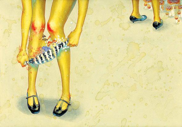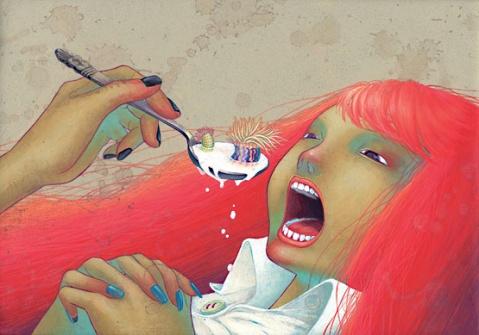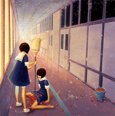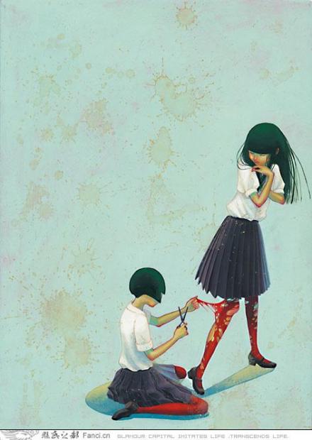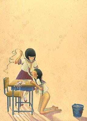 她画的是人性的恶。这些少女个个似乎都具有扭曲的人性,对社会充满着冷漠和仇怨。她们相互之间也没有同情心,即便是偶尔流露出的同情怜悯,也是一种把对方置于更惨淡处境的自以为是。女性生理期的来临在她那里被暗示出与性、怀孕之间的关联,她将其处理为一种莫名的恐惧和焦虑。比如一张漫画的画面:一个女孩叉腿坐在地上,红色的花瓣在裙子下涌出来,另一个女孩居高临下地拿着扫帚在她两腿之间捅这些花瓣,而旁边的水桶里装满了这些破碎的花瓣。我们很容易读出画面的象征含义,但是当她们置身于长长的教室廊道里,幽闭的空间、严苛的学校制度,廊道无尽的消失点似乎在说明着生理和心理煎熬的漫无止境。